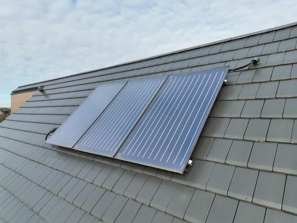 bei PV-Anlagen. Hier sind die Module der solaren Warmwasserbereitung und weitere bauliche Dachsysteme